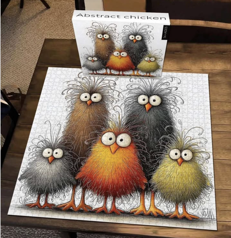 The featured painting for this event will be inspired by the whimsical and expressive chicken puzzle shown below. Expect playful textures, bold color, and lots of personality. While the final painting will be uniquely yours, the inspiration draws from the quirky charm and abstract style of the puzzle image.