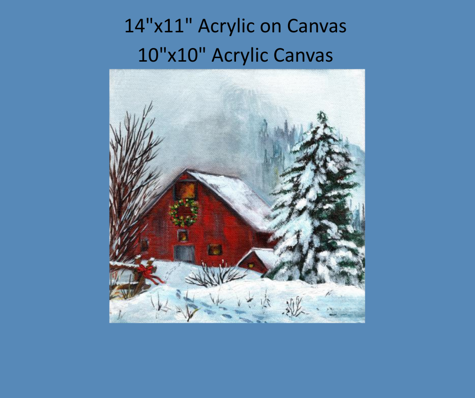 Bring the charm of the countryside to your canvas with this classic winter barn scene. A bright red barn, decorated with a festive wreath, stands quietly among snow-covered trees and soft mountain mist. Painted step-by-step in acrylics, this project is both beginner-friendly and deeply satisfying, offering plenty of room for creativity. Choose between a 14"x11" or 10"x10" canvas size, and by the end of the paint party, you’ll have a timeless piece that captures the simple beauty of a winter’s day.